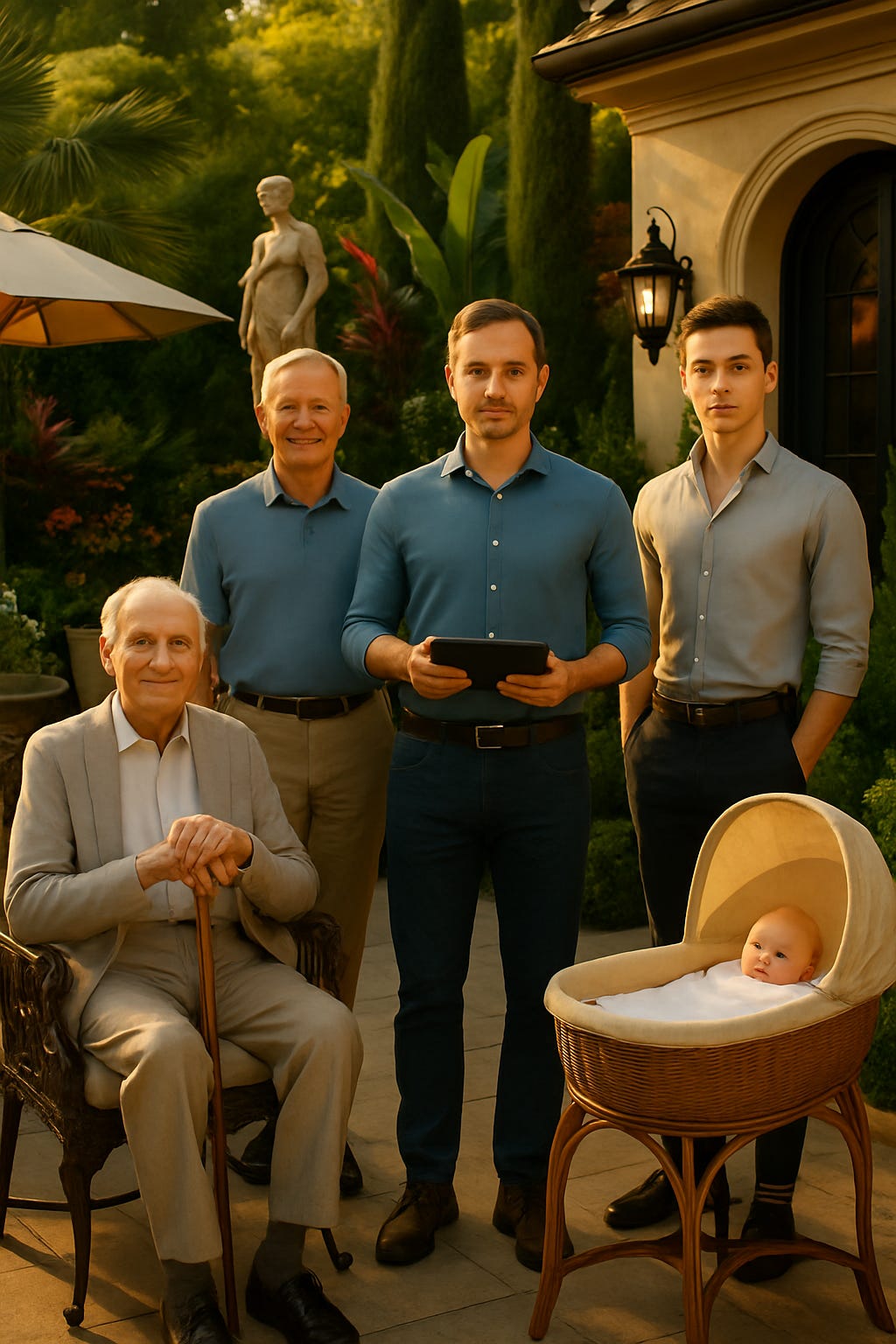 Within households, the strain expresses itself less in spreadsheets than in psychology. Gen X heirs in their late fifties begin caring for parents in their eighties while subsidizing children in their twenties—and soon enough grandchildren—without relinquishing the hope that an eventual bequest will cushion a retirement whose investment horizon now reads 2050-2060 rather than 2040-2050. Meanwhile, demographic projections indicate that the wealthy half of the Millennial cohort may see median life expectancy push past one hundred by 2055, especially if AI-accelerated drug discovery and in vivo gene editing deliver on even half their clinical trial pipelines. That means some Millennials will receive an inheritance, manage it for thirty years, and still pass it on at age eighty-five or ninety to heirs already midway through their own careers. The chain of capital allocation lengthens; its kinetic energy weakens.