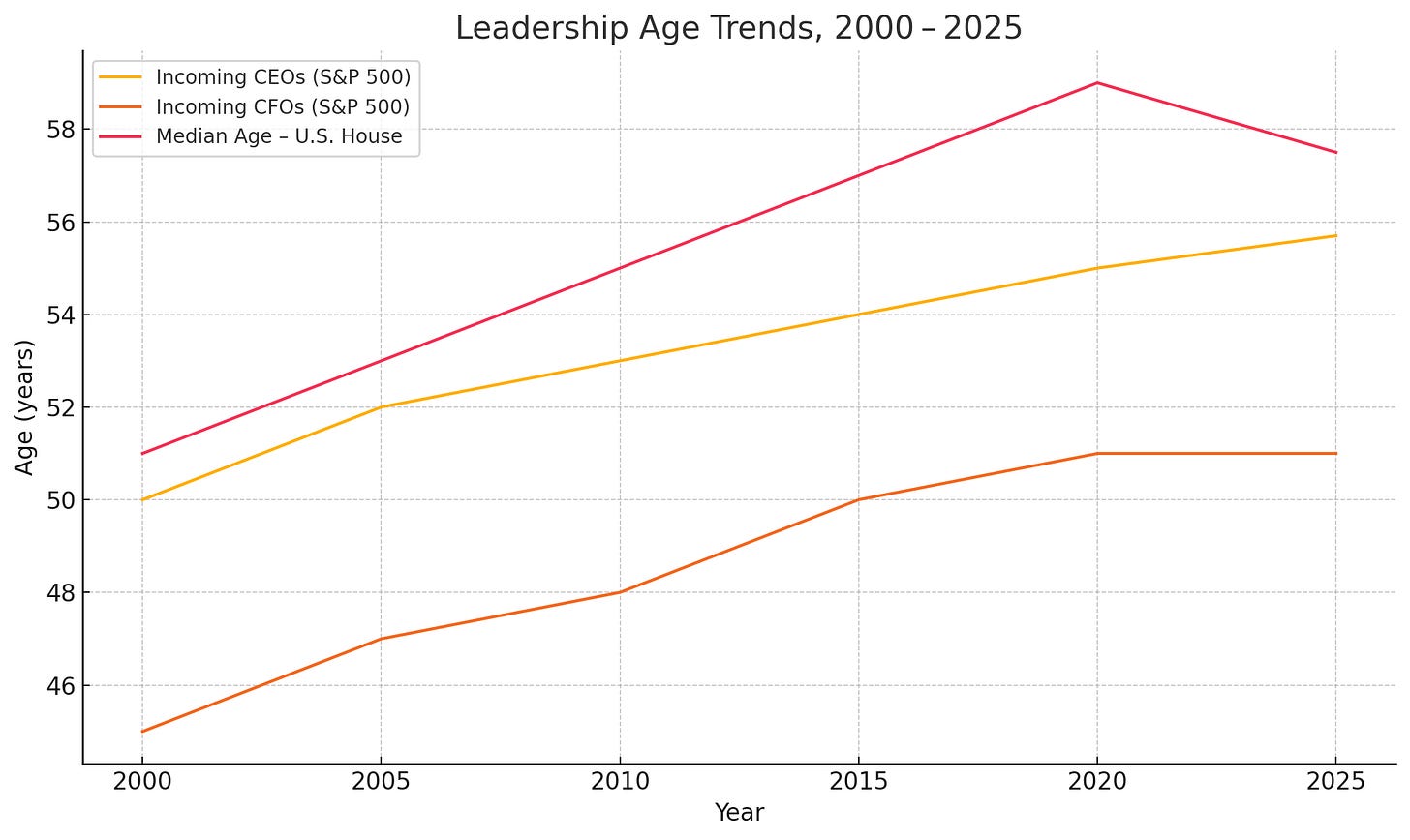 Corporate leadership data echo the stalemate. Spencer Stuart’s 2024 census of CEO transitions puts the average incoming CEO at 55.7, with nearly one in six aged sixty or older. Incoming CFOs hover around fifty-one, and House members in the 119th Congress settle at a median 57.5 years. Pew Research Center The timeline chart below shows all three lines ratcheting upward through 2000-2025 with only minor dips in recession years, underscoring how longevity gains compound institutional inertia.