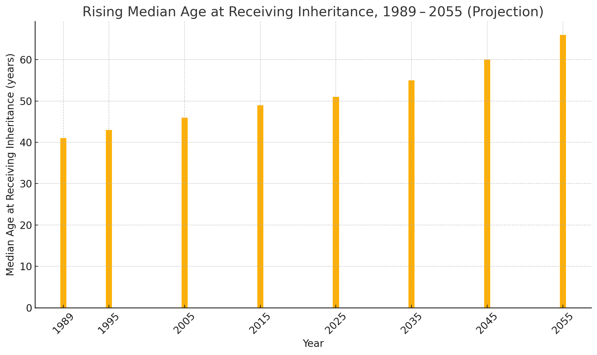 Every few years the headlines trumpet “the greatest wealth transfer in history,” and the numbers duly climb: Cerulli now pegs the hand-off at $124 trillion between 2025 and 2048—a figure that has already drifted upward twice since early 2024 Cerulli Associates. Yet the raw total obscures a more consequential shift: the timetable of inheritance is elongating even faster than the balance sheets are swelling. SeniorLiving.org, parsing Federal Reserve and actuarial datasets, finds that the average American heir—across all asset tiers—once took possession at age forty-one (1989), but today does so closer to fifty-one; the Los Angeles Times corroborates with a similar decade-long slip in receipt age, observing that more than a quarter of bequests now arrive when the beneficiary is already sixty-one or older. The bar chart below projects that trend through 2055, pushing the median hand-off into the mid-sixties unless something dramatically alters the pipeline.